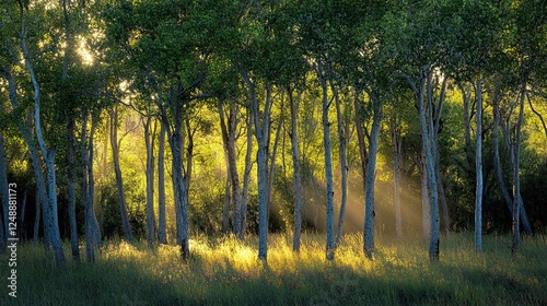 The watermark will not be included on Wall mural.: Sunlight filtering through trees creating golden hour forest scene