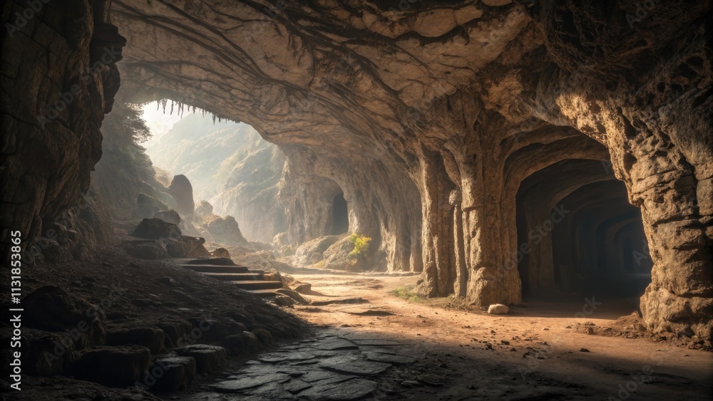 Wall mural sunlight filters through the entrance of a massive cave, illuminating a path leading deeper into the - Wall murals Wall mural sunlight filters through the entrance of a massive cave, illuminating a path leading deeper into the - Wall murals