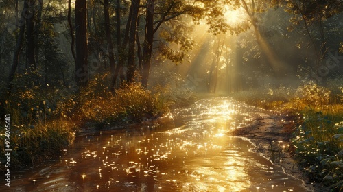The watermark will not be included on Wall mural.: Sunlight filters through trees over a serene forest stream at dawn