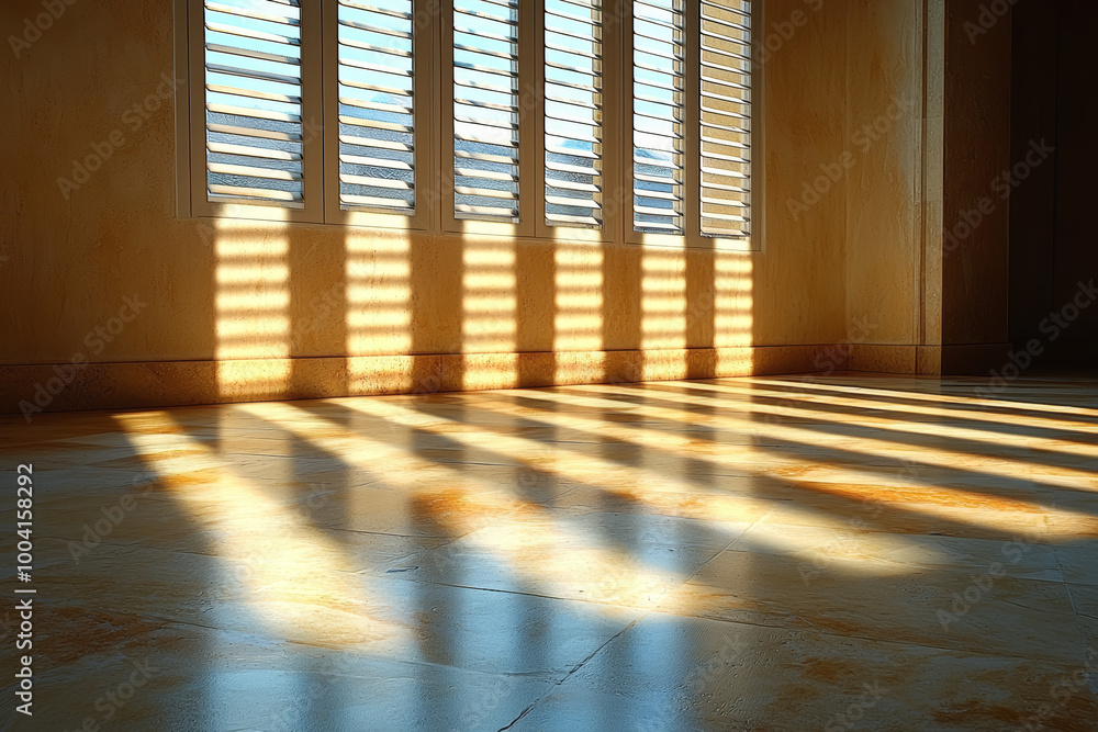 Wall mural sunlight passing through blinds, creating striped patterns on the floor. concept of design.
