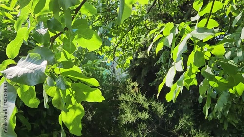 Wall mural sunlight penetrating through the branches of a walnut tree with lush green foliage moving from the w