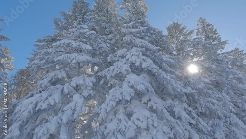The watermark will not be included on Wall mural.: Sunlight shining through evergreen trees covered in snow