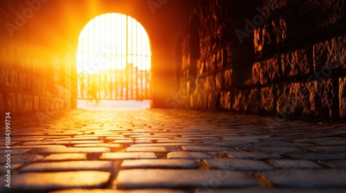 The watermark will not be included on Wall mural.: Sunlight streaming through an arched gate, illuminating a cobblestone path in a serene urban setting