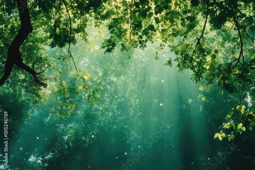 The watermark will not be included on Wall mural.: Sunlight streams through lush green canopy, creating ethereal forest scene -