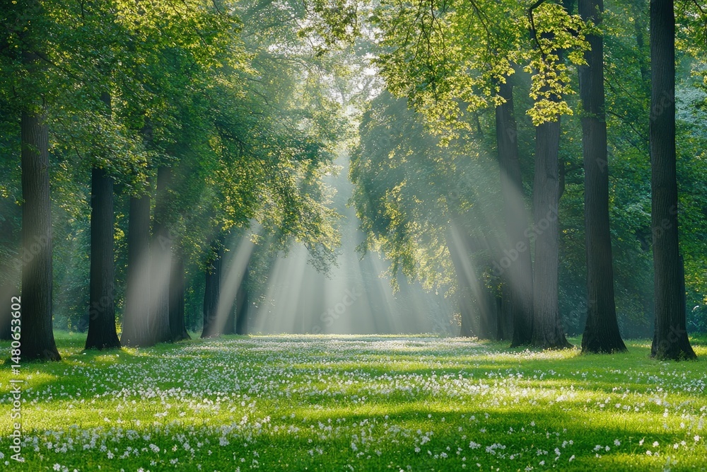 The watermark will not be included on Wall mural.: Sunlight streams through trees in park