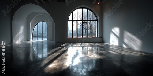 The watermark will not be included on Wall mural.: Sunlight streams via large arched window in empty modern gallery, casting long shadows on polished c