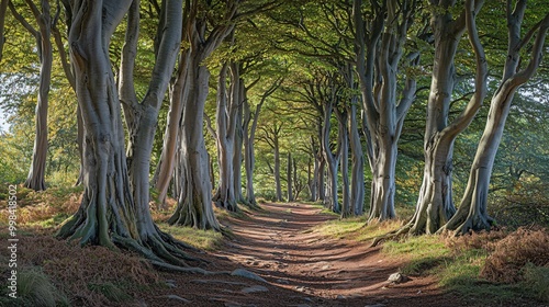 The watermark will not be included on Wall mural.: Sunlit path through a forest of tall trees with thick trunks -
