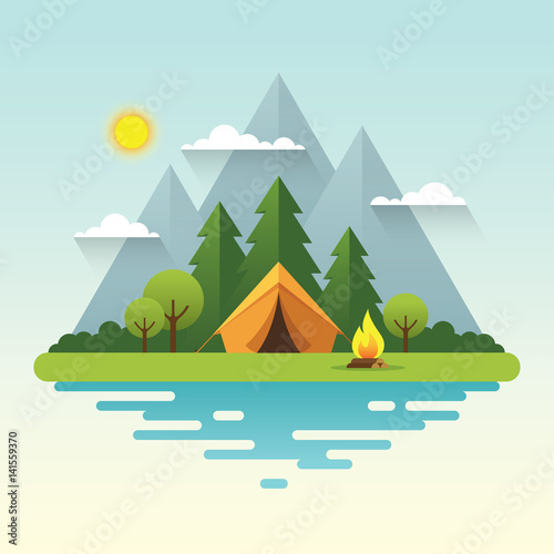 The watermark will not be included on Wall mural.: Sunny day camping illustration in flat style