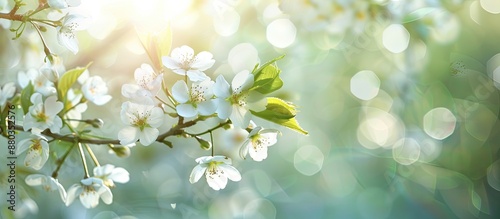 Wall mural sunny day showcases a branch of flowering cherry tree with small white flowers creating a spring bac - Wall murals Wall mural sunny day showcases a branch of flowering cherry tree with small white flowers creating a spring bac - Wall murals