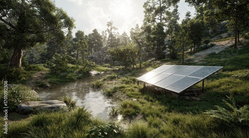 Wall mural sunny forest scene with solar panel. tranquil woodland with a small stream and a solar panel array s
