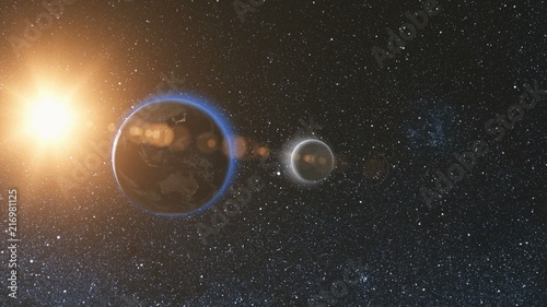 The watermark will not be included on Wall mural.: Sunrise view from space on planet earth and moon rotating in space against the background of the sta
