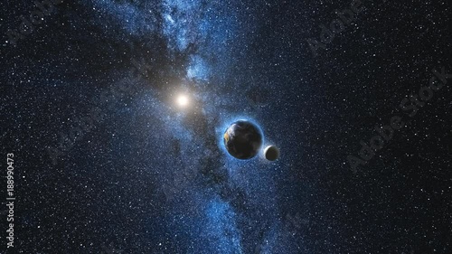 Wall mural : Sunrise view on planet earth and moon satellite rotating and spinning in open space, blue milky way