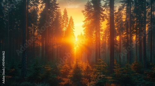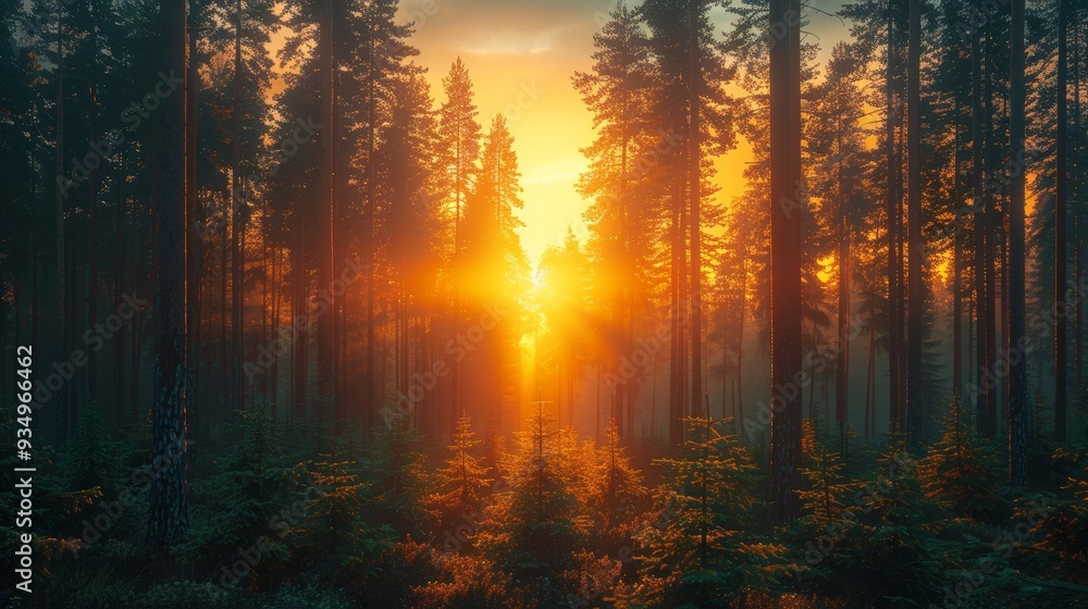 The watermark will not be included on Wall mural.: Sunset filtering through tall trees in a dense forest during twilight