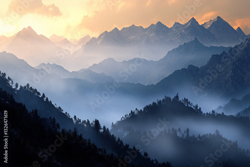 The watermark will not be included on Wall mural.: Sunset mountain layers generative ai