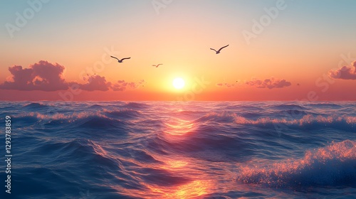 Wall mural sunset over the ocean features realistic soft waves and flying seagulls in warm golden light with or - Wall murals Wall mural sunset over the ocean features realistic soft waves and flying seagulls in warm golden light with or - Wall murals