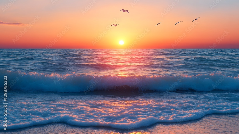 Wall mural sunset over the ocean features realistic soft waves and flying seagulls in warm golden light with or - Wall murals Wall mural sunset over the ocean features realistic soft waves and flying seagulls in warm golden light with or - Wall murals