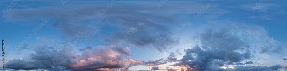 Wall mural sunset sky panorama with bright glowing pink cumulus clouds. hdr 360 seamless spherical panorama. fu