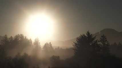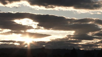 Wall mural : Sunset time lapse over forest hillside with sun setting behind trees with clouds passing and beautif