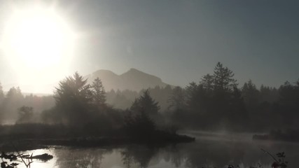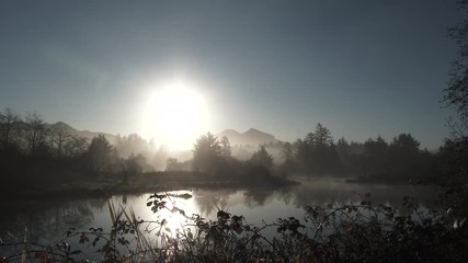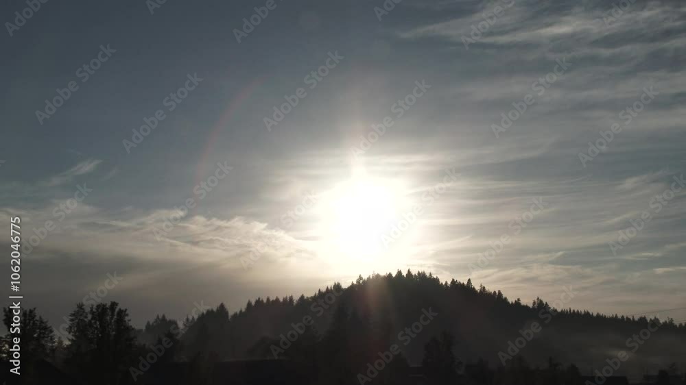 The watermark will not be included on Wall mural.: Sunset time lapse over forest hillside with sun setting behind trees with clouds passing and beautif