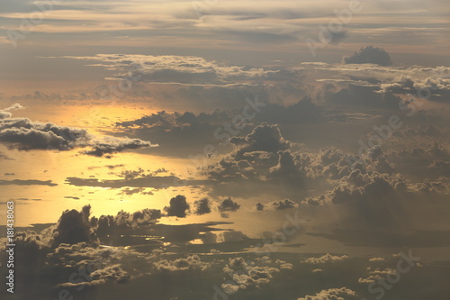 Wall mural sunset white cloud sky at high level attitude, view from window airplane