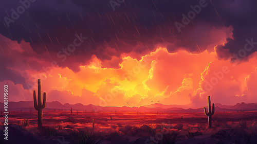 Wall mural sunset with monsoon storm clouds in the arizona desert depth of field. monsoon. illustration