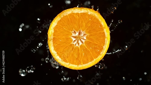 The watermark will not be included on Wall mural.: Super slow motion of orange slice with water splashes - rotating slice of orange with splashing water