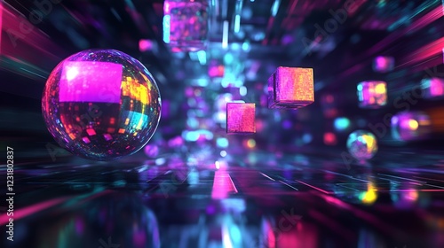 The watermark will not be included on Wall mural.: Surreal abstract spheres and cubes with vibrant reflections floating in a digital space