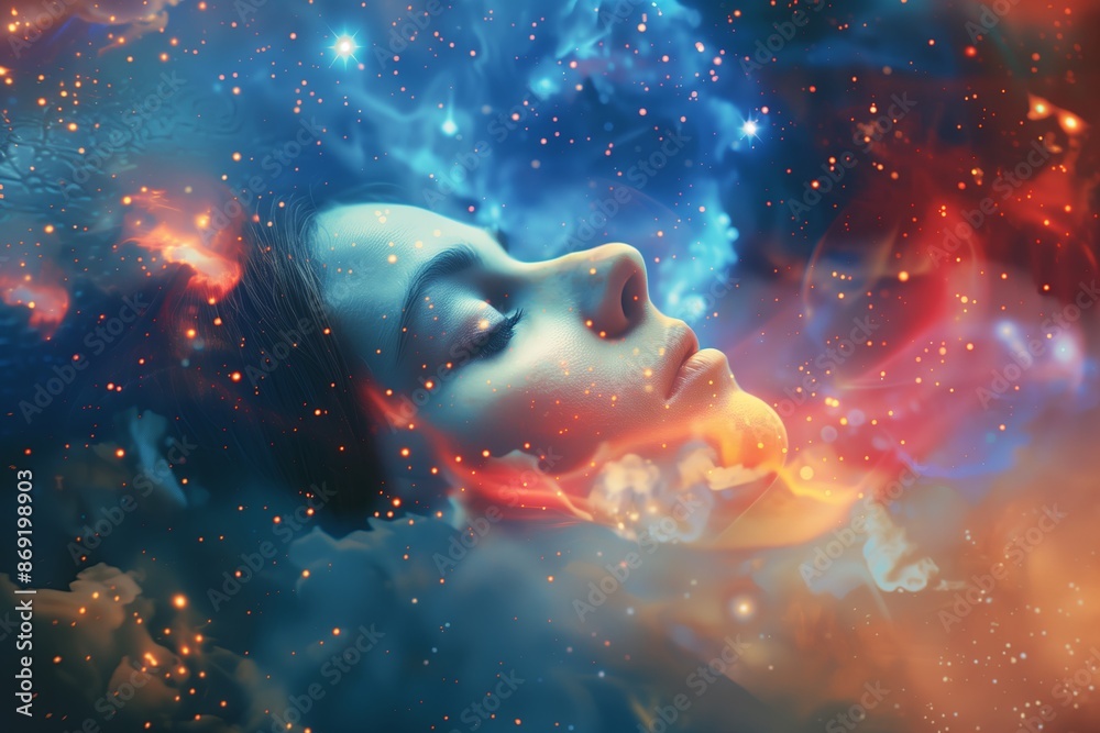 The watermark will not be included on Wall mural.: Surreal and abstract imagery combining human faces with galaxy and nebula elements, exploring the