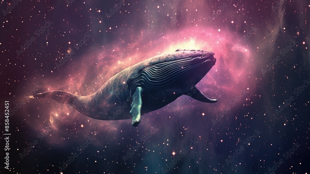 The watermark will not be included on Wall mural.: Surreal art design of a whale floating in space with a cosmic background and starry sky - digital art