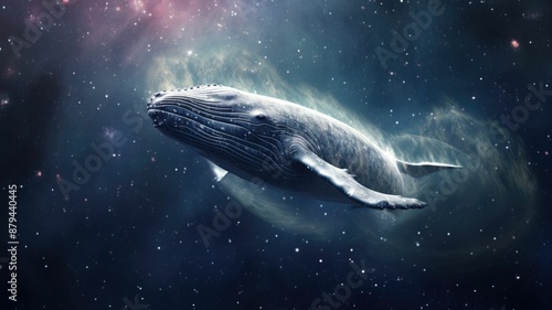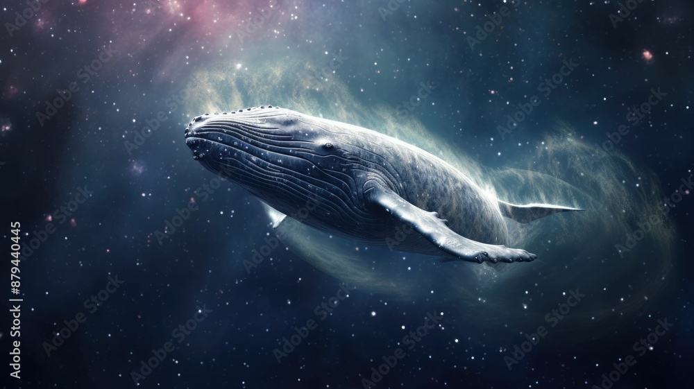 The watermark will not be included on Wall mural.: Surreal art design of a whale floating in space with a cosmic background and starry sky - digital art