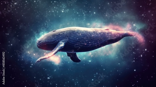 The watermark will not be included on Wall mural.: Surreal art design of a whale floating in space with a cosmic background and starry sky - digital art