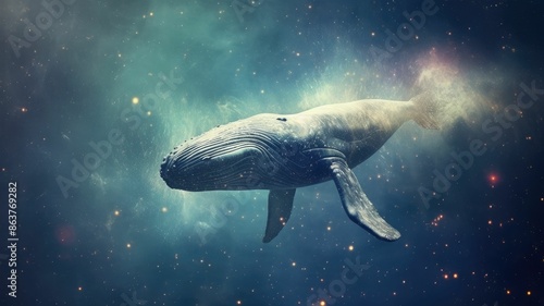 The watermark will not be included on Wall mural.: Surreal art design of a whale floating in space with a cosmic background and starry sky - digital art
