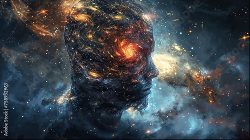 The watermark will not be included on Wall mural.: Surreal digital art of a human profile with galaxy patterns replacing the brain, enhancing the conce