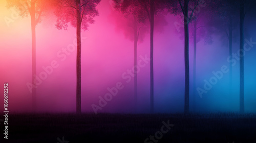 The watermark will not be included on Wall mural.: Surreal forest landscape with vibrant colors and misty atmosphere, showcasing tall trees in shades o