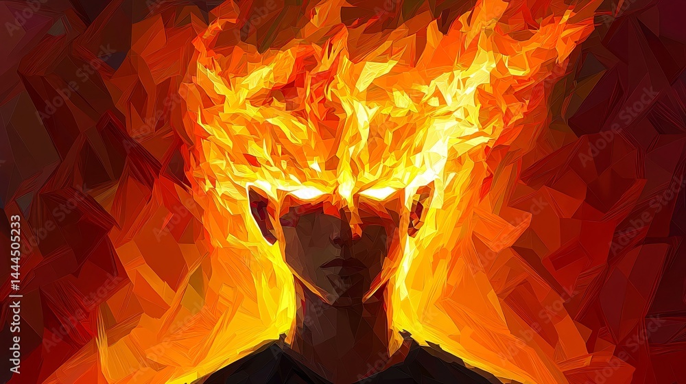 The watermark will not be included on Wall mural.: Surreal representation of a man with fiery head symbolizing ethereal illumination and energy in a st