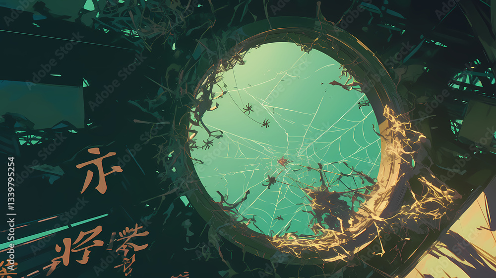 The watermark will not be included on Wall mural.: Surreal view from below a circular opening, surrounded by webs and abstract shapes, evoking mystery