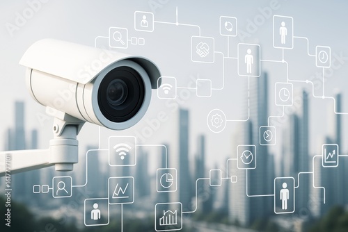Wall mural surveillance camera with digital technology interface overlay on city background representing data s - Wall murals Wall mural surveillance camera with digital technology interface overlay on city background representing data s - Wall murals