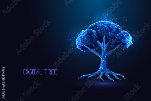 The watermark will not be included on Wall mural.: Sustainable digital tree with polygonal blue wireframe structure on dark blue background - esg vector