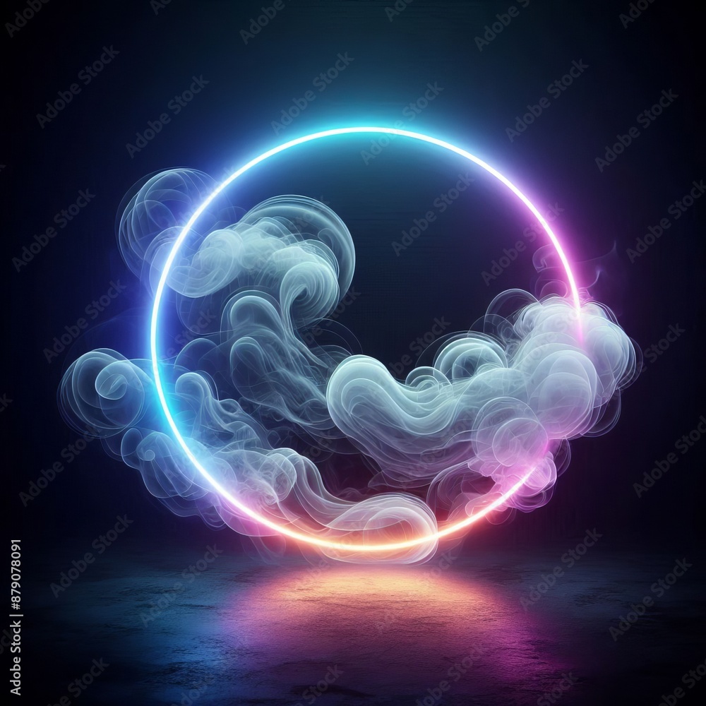 The watermark will not be included on Wall mural.: Swirling circles of light in a bright rainbow pattern create a dynamic abstract space isolated black