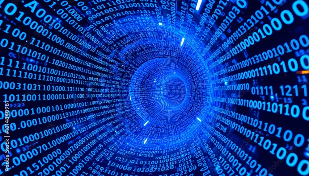 Wall mural : Swirling vortex of blue binary code in a virtual world