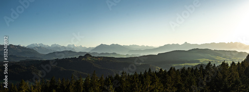 Wall mural : Swiss mountain range in switzerland while the valley is covered in fog during sunset, super warm lig
