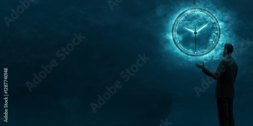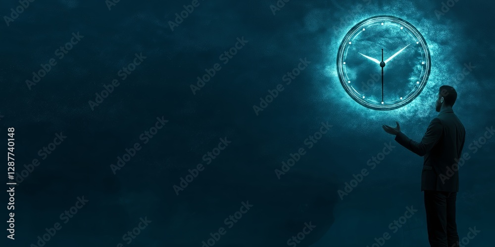 The watermark will not be included on Wall mural.: Symbolic artwork of a clock with its hands glowing, a figure staring at it with excitement, visualiz