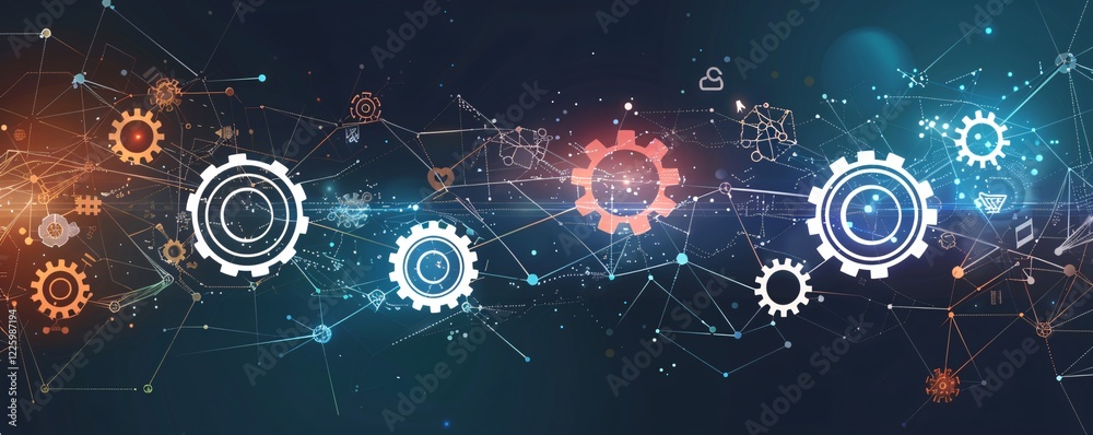 Wall mural : Symbolizing innovation and teamwork in technology: abstract digital network connects gears in cybers