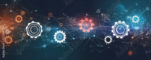 Wall mural symbolizing innovation and teamwork in technology: abstract digital network connects gears in cybers - Wall murals Wall mural symbolizing innovation and teamwork in technology: abstract digital network connects gears in cybers - Wall murals