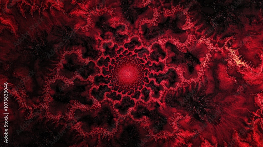 The watermark will not be included on Wall mural.: Symmetrical red abstract fractal backdrop featuring a black base color