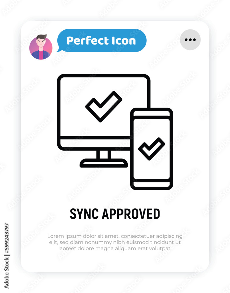 Wall mural : Sync between computer and smartphone is approved: check marks are on device screens - thin line icon -