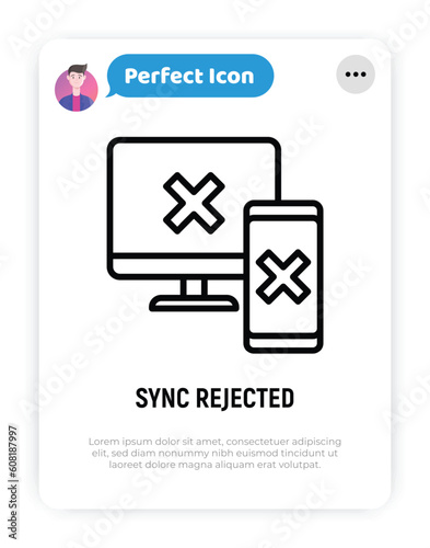 Sync between computer and smartphone is rejected: cross marks are on device screens - thin line icon - Wall mural