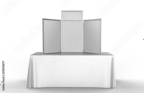 Wall mural table top folding display board for trade show. 3d render illustration.