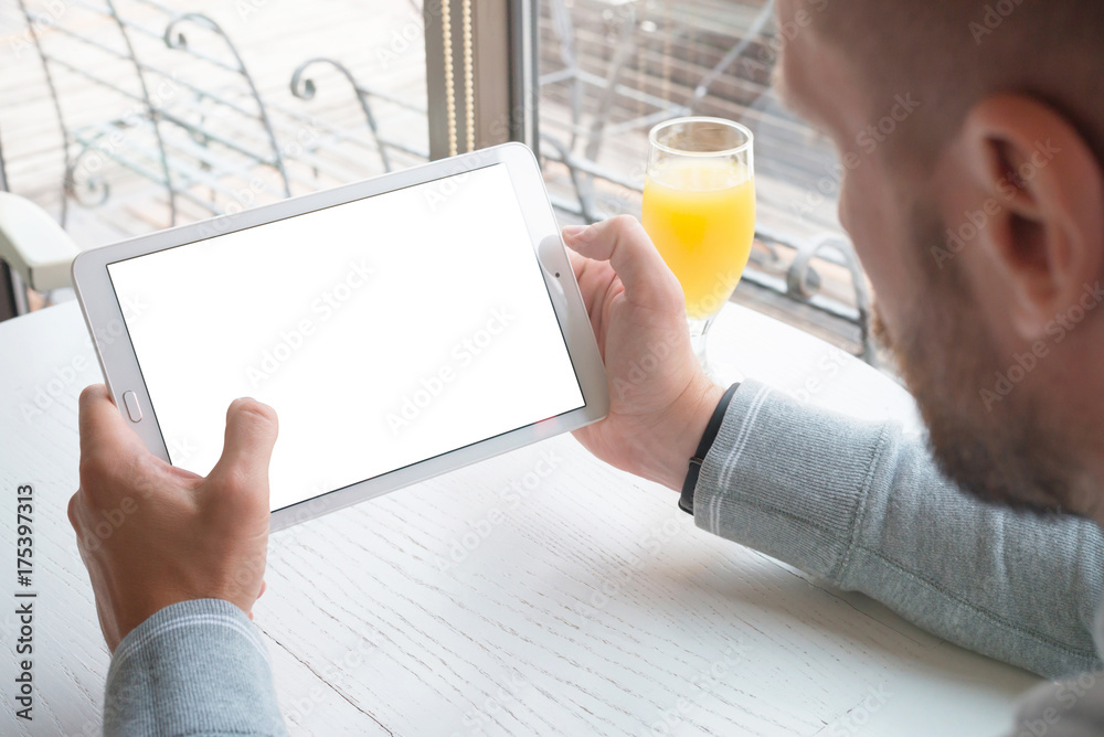 Wall mural : Tablet mockup - guy hold tablet in horizontal position - app or responsive web site design promotion -