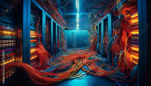 Wall mural tangled cables in server room depicting tech chaos and it issues